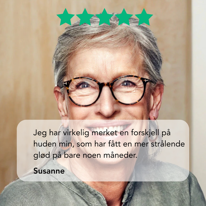 De fleste ser synlige resultater etter 8–12 uker med daglig inntak. Vitenskapelige studier viser at rynkedybden reduseres og hudens fuktighet øker markant! På nettsiden vår kan du lese mer om en rekke studier og resultater – og se hva kundene våre sier om sine opplevelser.