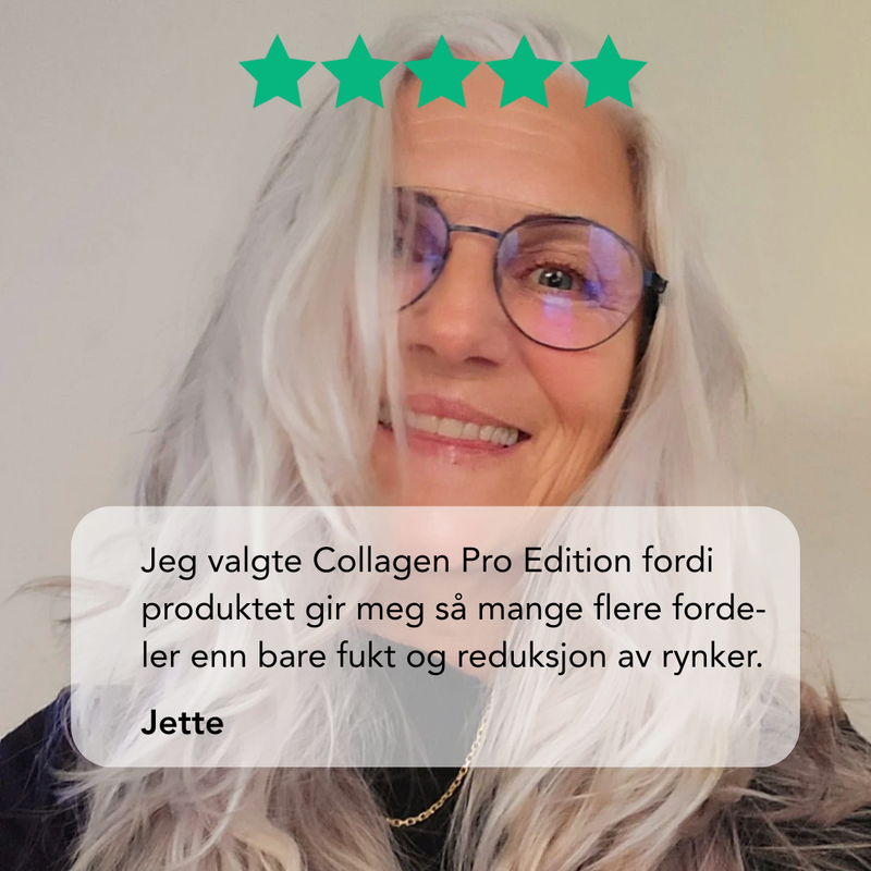 Kollagen er et protein som finnes naturlig i kroppen – kjent som kroppens lim og byggestein. Opptil 80 % av huden vår kan inneholde kollagen. Fra 25-årsalderen synker kollagennivået med 1–2 % årlig, noe som fører til tap av elastisitet og fasthet i huden og dannelse av rynker. Daglig inntak av marint kollagenpulver har dokumentert effekt på reduksjon av rynker og oppnåelse av en glattere hud med mer glød og færre rynker.