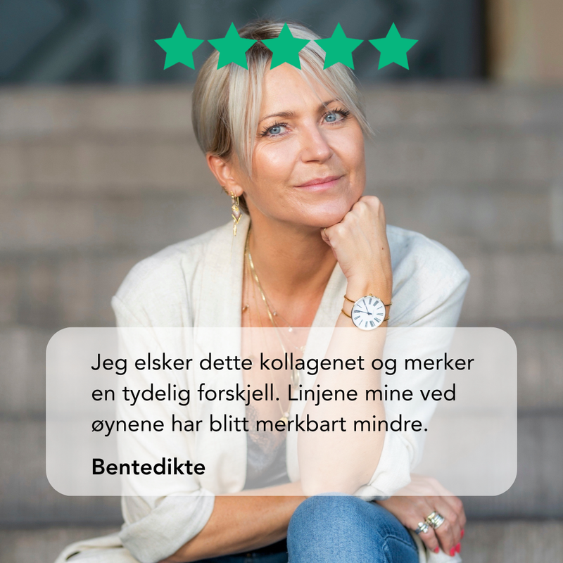 Men etter hvert som vi blir eldre, synker nivåene av både kollagen og hyaluronsyre, noe som fører til rynker og tap av elastisitet og fuktighet! Ved å ta et daglig tilskudd av kollagenpulver, vil man allerede etter noen måneder kunne merke en forbedring i hudens tilstand.