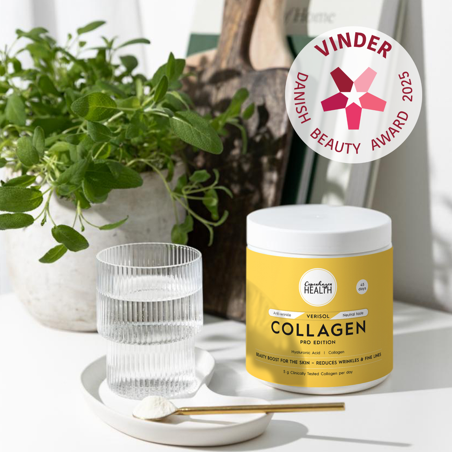 Velger du Verisol Collagen Pro Edition, får du det mest smaknøytrale kollagenpulveret på markedet, beriket med hyaluronsyre – vinner av Danish Beauty Award 2025 i kategorien Inner Beauty.