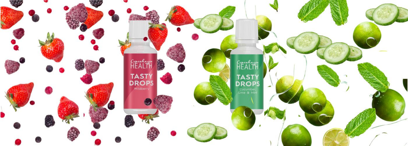 Prøv våre deilige smakdråper med smak av ville bær eller agurk, lime og mynte. Bruk dem gjerne i et glass vann med kollagenpulver, hvis du ønsker å gi din daglige kollagenboost en frisk smak.
